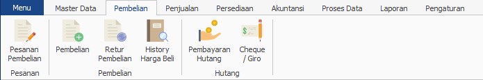 Transaksi Pembelian digunakan untuk mencatat data Item yang sudah dibeli dari Supplier dan barang sudah diterima. Pada saat Pembelian dibuat, stok barang akan otomatis bertambah. Transaksi Pembelian dapat dibayar secara Tunai atau Kredit (pembayaran dengan jatuh tempo)